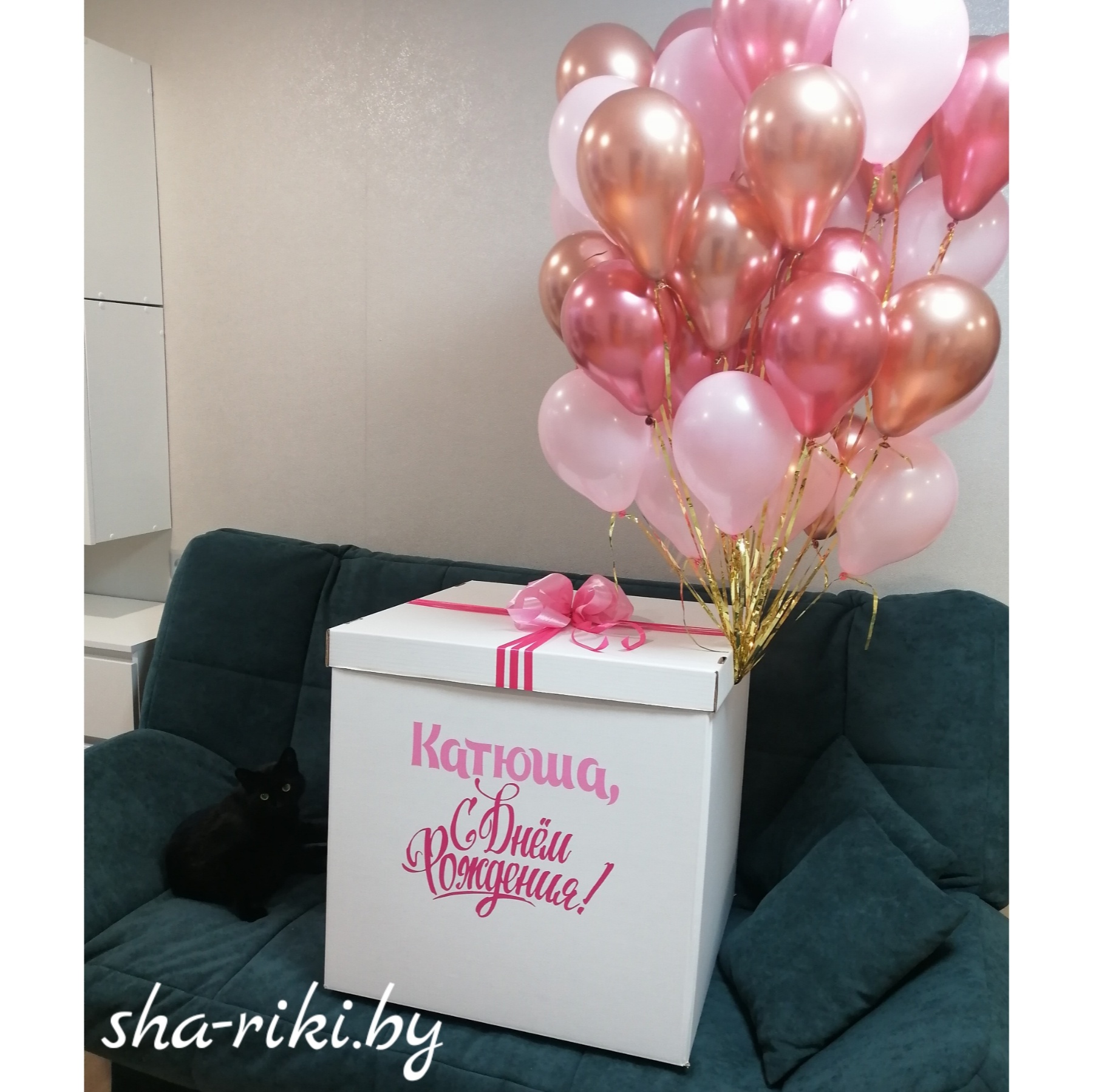 Белая коробка 60*60*60 см с индивидуальной надписью и бантом из атласной ленты с мини-шарами внутри (40 шт: 20 пастельных и 20 хром)