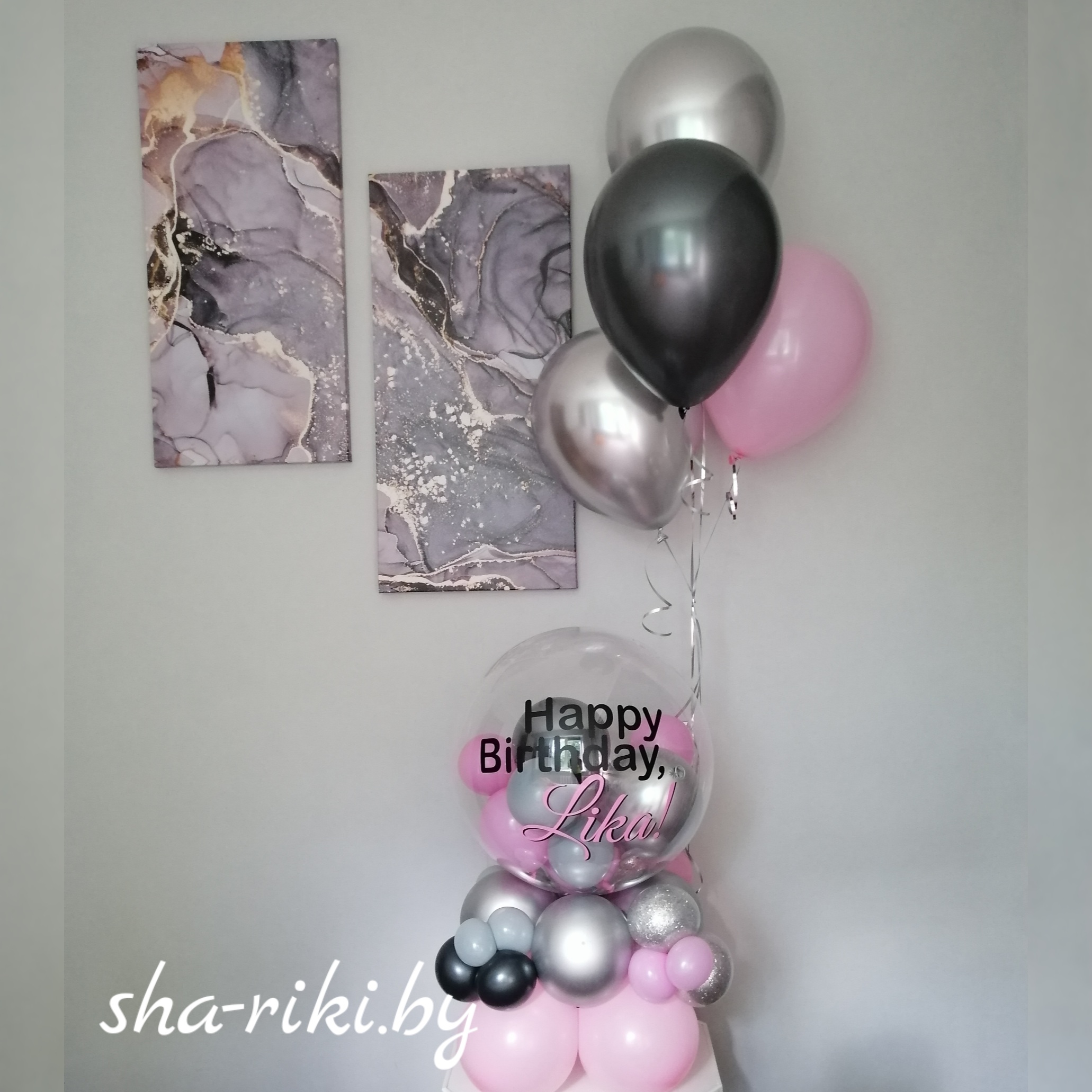 Композиция из воздушных шаров, в основе которой - сфера с наполнением из мини-шариков и Ваша персональная надпись
