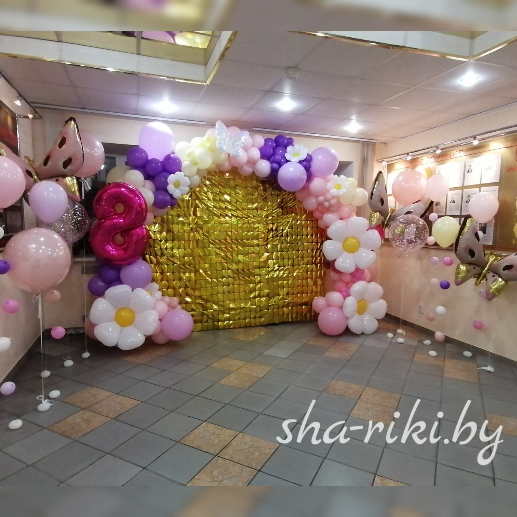 Разнокалиберная арка с занавесом и декором из фольгированной цифры и ромашек. В оформление также входят следующие гелиевые шары: фольгированные бабочки (3 шт), сферы с конфетти (2 шт), большие "стеклянные" шары (3 шт) и стандартные 12" шары с "капельками" (5 шт)