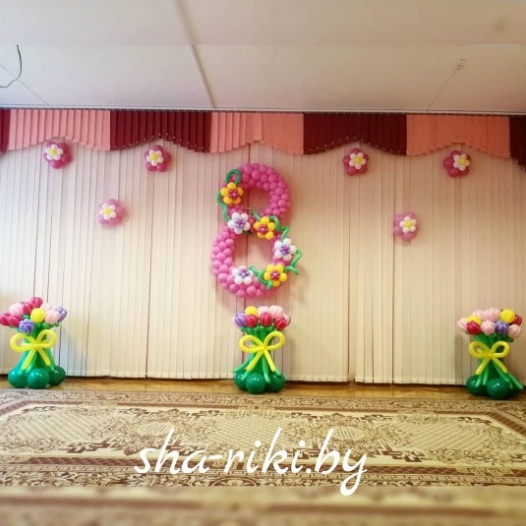 Каркасная цифра 8 (с монтажом на карниз), 6 двуслойных цветов и 3 букета-клумбы по 15 тюльпанов в каждом