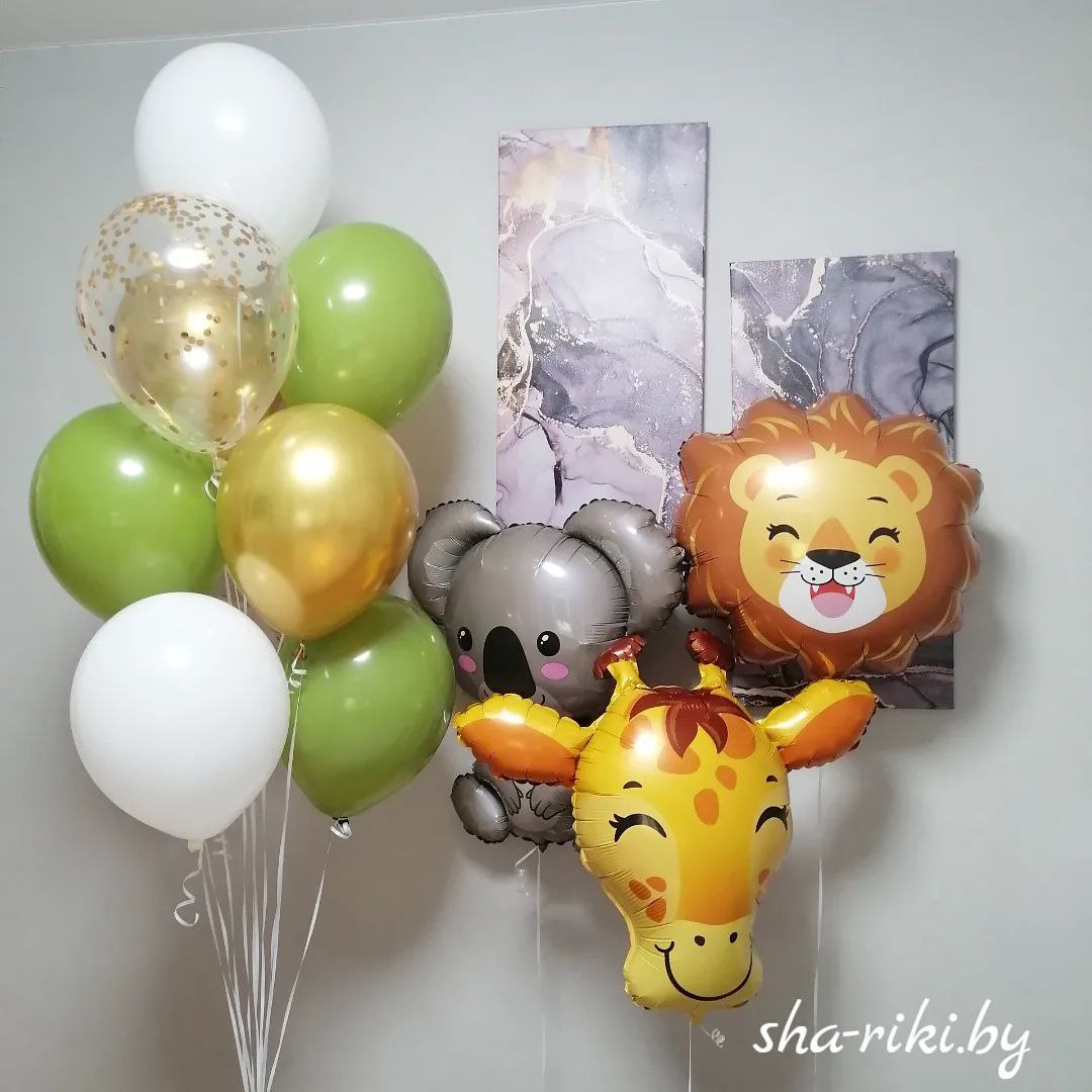 3 фольгированные фигуры зверят и фонтан из 10 гелиевых шаров
