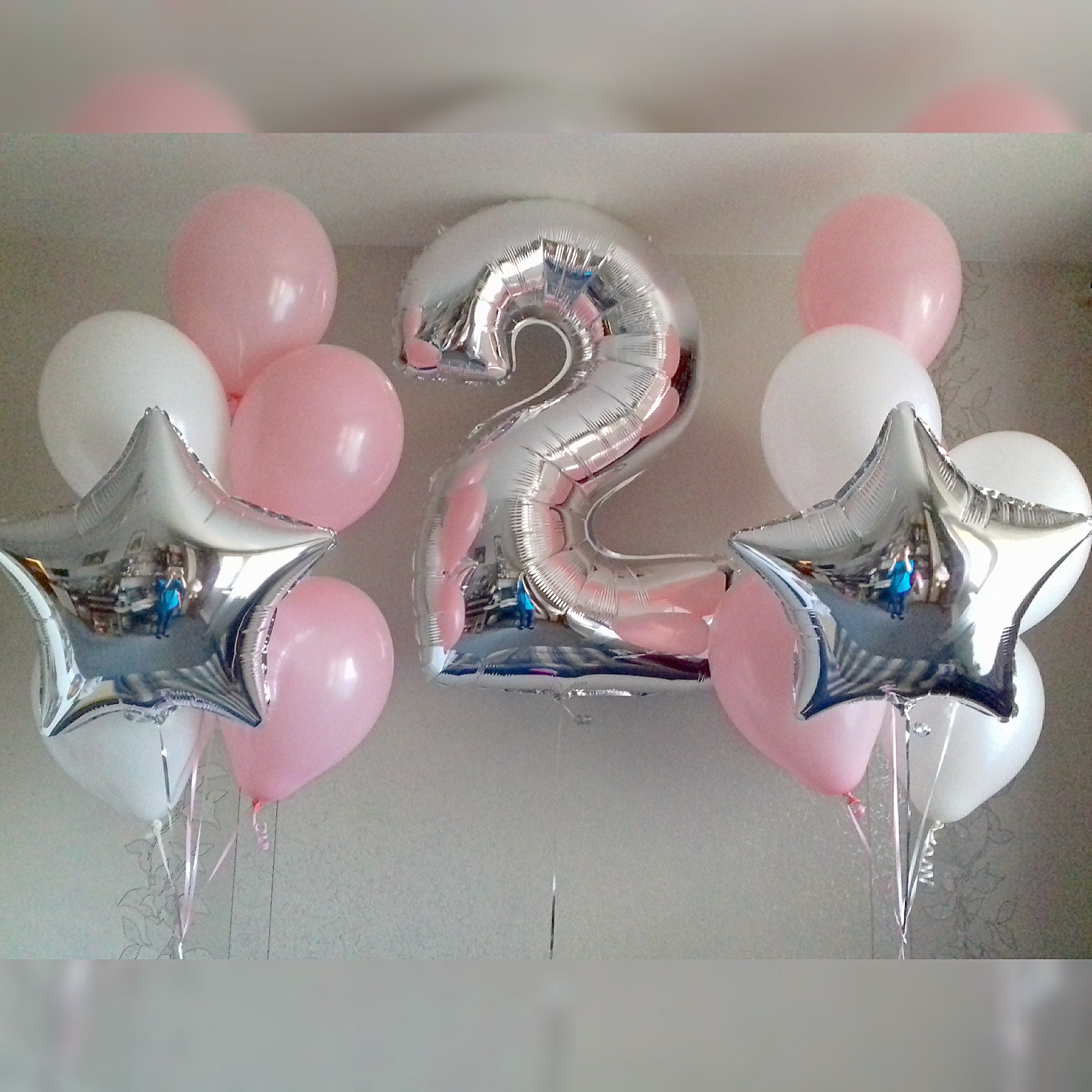 Любая фольгированная цифра и два фонтана со звездами и 6 латексными шарами (с обработкой)