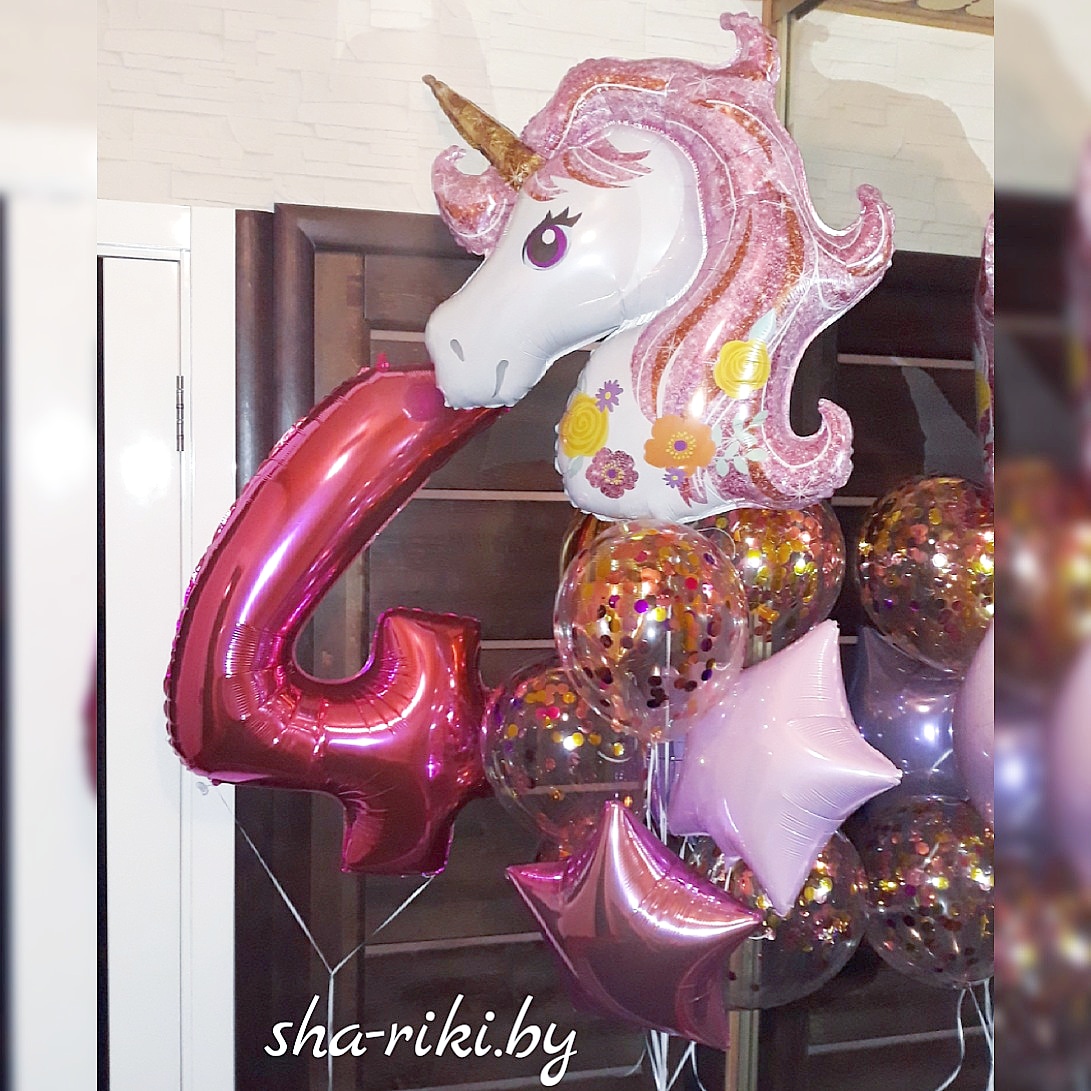 Любая фольгированная цифра и фонтан на 10 шаров с единорогом (фольгированная фигура, 4 звезды и 5 шаров с конфетти)