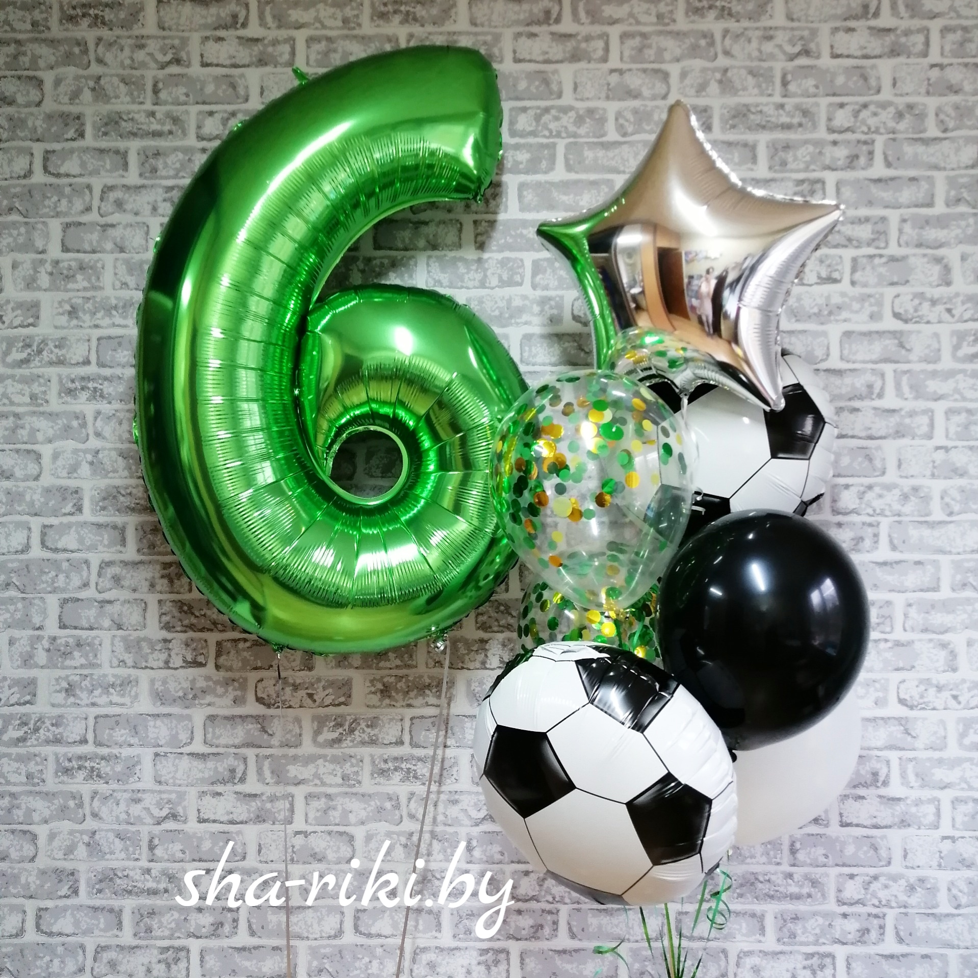 Фольгированная цифра и фонтан из 7 шаров: звезда и 2 футбольных мяча, 2 шара с конфетти и 2 однотонных гелиевых шара