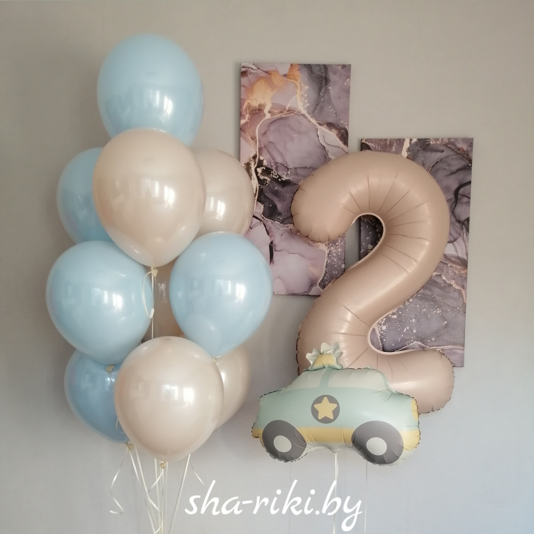 Любая фольгированная цифра с гелием, фольгированная фигура МАШИНКА и фонтан, состоящий из 10 латексных шаров со "стеклянным" эффектом. Время полета - от 3 дней