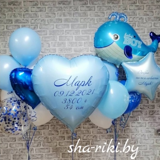 Данный сет состоит из 2 фонтанов (первый: 5 однотонных шаров, 1 шар с конфетти и фольгированное сердце; второй - 3 однотонных шара, 1 гелиевый шар с рисунком, звезда с индивидуальной надписью и фигура кита) + большое сердце-метрика