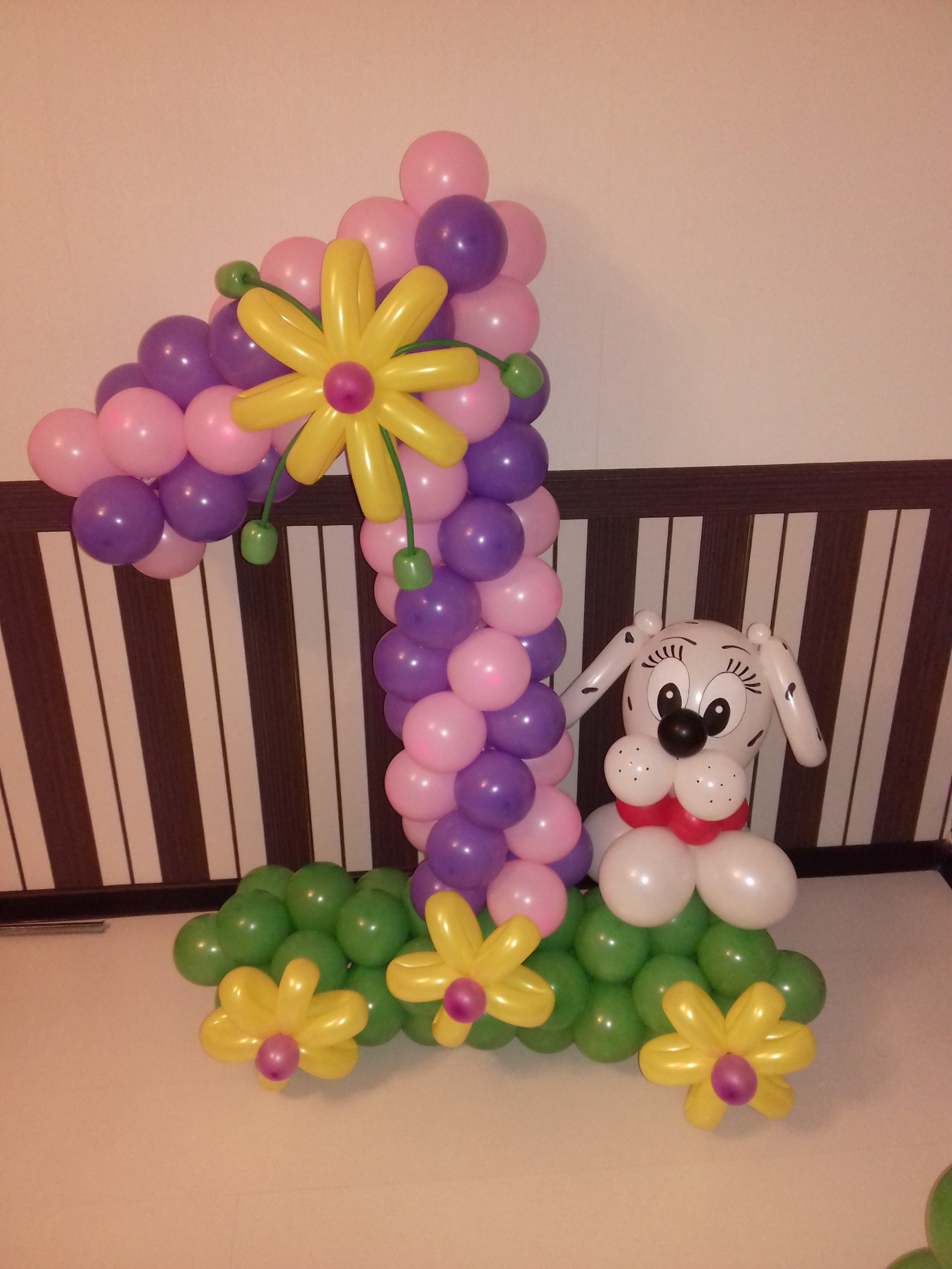 Цифра из воздушных шаров с собачкой и ромашками. Цвет можно изменить по Вашему желанию